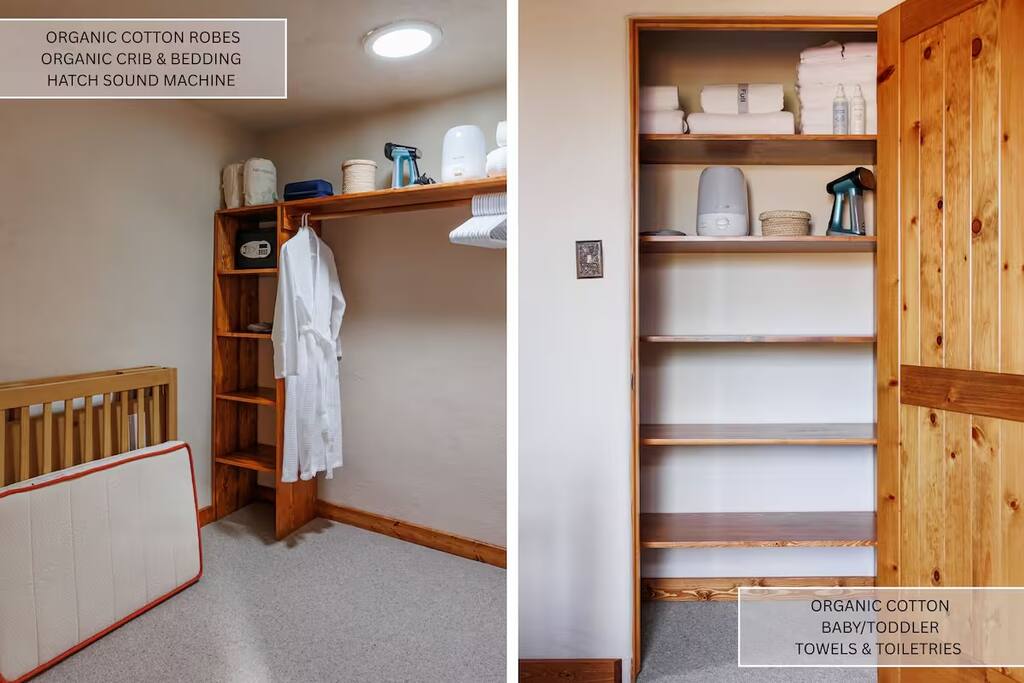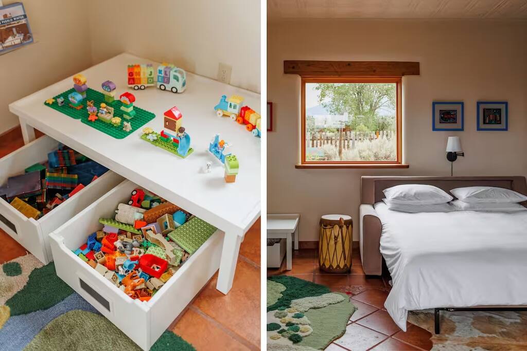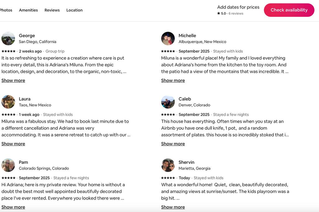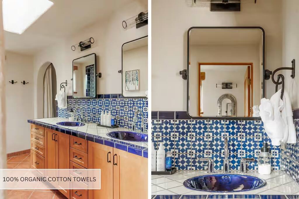 ⭐️KEY FEATURES⭐️ ▪︎ Fragrance-free home ▪︎ All-organic: beds, pillows, bedding, towels, toiletries, spices, coffee, and tea ▪︎ 4 bedrooms + nursery: 1 king, 1 California king, 1 twin-over-full bunk, 1 queen sleeper sofa, 1 mini crib — all Avocado organic mattresses with organic cotton bedding ▪︎ 3 full bathrooms: two en-suite with walk-in showers; one hall bath with shower/tub combo — luxury non-toxic toiletries provided ▪︎ Four fully furnished private patios, fire table, smokeless fire pit, hot tub, star-gazing deck, herb/veggie/fruit garden ▪︎ Full kitchen with stainless steel appliances and non-toxic cookware ▪︎ Kitchenette with premium organic coffee and tea bar ▪︎ Full playroom: child’s table and chairs, child’s eating utensils, high chair and booster seats, outdoor children’s picnic table ▪︎ Free Wi-Fi and three Smart TVs ▪︎ Kiva fireplace ▪︎ In-suite laundry room with washer, dryer, and non-toxic cleaning products ▪︎ Free on-site parking ⭐️OUTSIDE⭐️ Step outside and experience the magic of Miluna's high-desert setting. Meandering garden paths lead you through native landscaping, vibrant flower beds, and tucked-away seating areas perfect for morning coffee or sunset chats. The back patio offers stunning views of Taos Mountain, with an al-fresco dining area, fire table/soft seating area, and hot tub for starlit evenings. Whether you're soaking in the hot tub, sharing a grilled dinner, or watching the kids explore the gardens, every corner of the outdoor space invites you to slow down, connect, and savor the beauty of the Southwest. ⭐️BEDROOMS⭐️ Each bedroom is designed with authentic Southwestern furniture and decor, paired with premium Avocado organic mattresses and pillows, topped with 100% organic 400-thread count sheets and bedding for a truly restful sleep. Located in separate wings of the house, each room offers added privacy. Thoughtful touches like a full-length mirror, soft seating, dimmable lighting, and ample space to hang or fold clothes complete each serene retreat. Bedroom 1 - California king in the main master with en-suite bath, walk-in closet/nursery with mini crib and private patio. Bedroom 2 - twin over full bunk room with access to hall bath. Bedroom 3 - queen sleeper sofa in the attached casita with the playroom, kitchenette and private patio - pass through room to bedroom 4. Bedroom 4 - king in the casita master with en-suite bath and private screened-in porch. ⭐️BATHROOMS⭐️ 3 full bathrooms are adorned with handmade Mexican tile and hand-forged wrought iron hardware for an authentic luxurious experience. Each is stocked with plush 100% organic cotton towels, luxury non-toxic toiletries (including: shampoo, body wash, conditioner, body cream, leave-in conditioner, and hairspray), a salon-quality hairdryer, black make-up washcloths, and a light-up magnifying mirror for added comfort and ease. ⭐️KITCHEN | DINING | LIVING⭐️ This welcoming adobe haven boasts an open-concept layout rich in Southwest charm - featuring viga ceilings, a tiled nicho, stained glass, picture windows w/mountain views, and a traditional kiva fireplace. The main living area invites connection around the hearth, ideal for cozy reading or game nights, while a separate sitting area offers a Smart TV, record player, curated vinyl, travel books, and board games. The fully stocked kitchen includes an island with seating for 2 and flows seamlessly into a rustic dining space with seating for 7, plus a charming children's table for 2. Whether you're cooking, relaxing, or sharing stories, every corner is crafted for warmth, authenticity and togetherness. ⭐️CASITA | KITCHENETTE | PLAYROOM⭐️ The casita invites you into a thoughtfully designed space where comfort and creativity meet. The kitchenette is fully equipped with a premium organic coffee and tea bar with handmade ceramic mugs - making it a cozy spot for morning brew or afternoon tea. The adjoining lounge features an American Leather sleeper sofa, Smart TV and mountain views, with direct access to a private patio for fresh air and sunshine. Just beyond, a beautifully appointed playroom offers a world of imagination for little ones, featuring bins stocked with Magnatiles and Legos, themed books, play food, and a modular ottoman. It's a peaceful, joyful space designed to delight children and give caregivers a moment of ease. ⭐️🌙Your peaceful Taos escape awaits. Reserve your dates today - we look forward to hosting your stay at Miluna!⭐️🌙